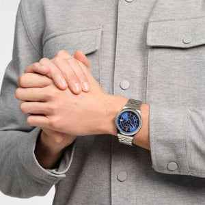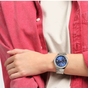 ساعة لكلا الجنسين 42 ملم من ماركة Swatch، حركة أوتوماتيكية، تتمميز بتصميمها المستوحى من البوصلة البحرية ومينائها الأزرق بلمسة شمس لا نهاية لها.