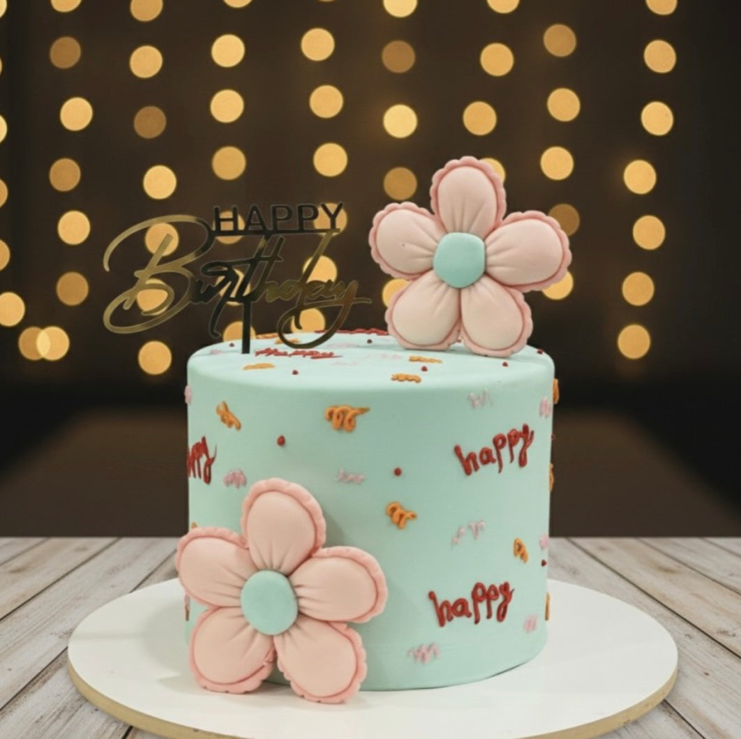قالب كيك سكري أنيق بتصميم ناعم ولون باستيل هادئ، مزيّن بزهور سكر مصنوعة يدوياً ولمسة احتفالية راقية، مثالي لأعياد الميلاد والمناسبات الخاصة. يتميز بتفاصيل دقيقة تعكس فخامة التصميم وجماله.