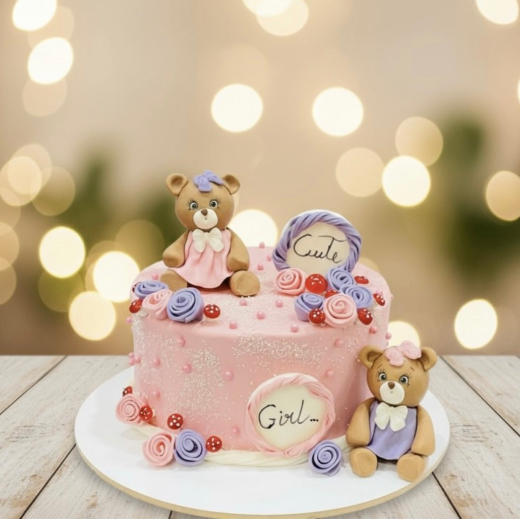 قالب كيك سكري بتصميم طفولي ناعم وألوان وردية هادئة، مزيّن بدمى دببة لطيفة وتفاصيل سكر مصنوعة يدوياً، مثالي لاحتفالات المواليد وأعياد الميلاد الأولى. يتميز بلمسة أنثوية جذابة وتنسيق دقيق يعكس جمال المناسبة.