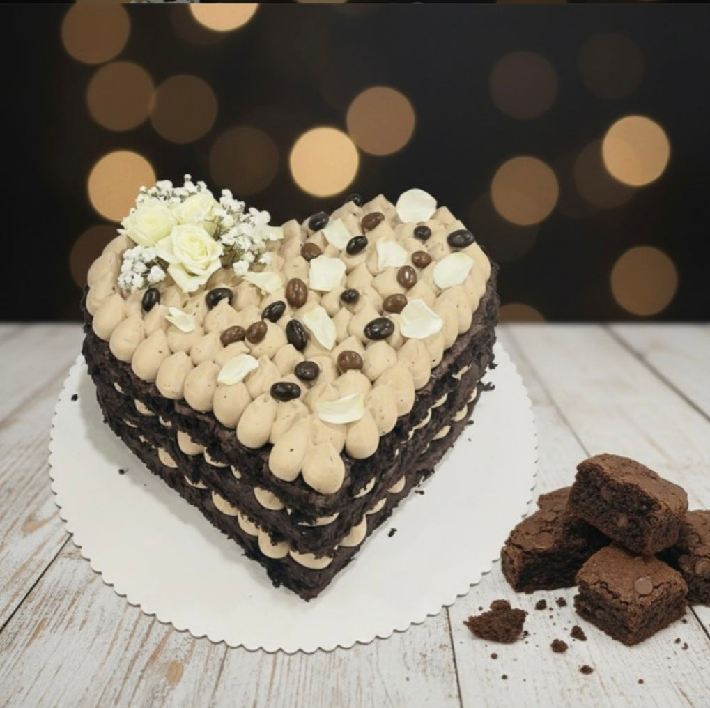 قالب كيك براونيز بتصميم أنيق على شكل قلب، بطبقات غنية من البراونيز مع كريمة ناعمة وتزيين راقٍ بلمسات شوكولاتة وزهور خفيفة، مثالي للمناسبات الرومانسية والاحتفالات الخاصة. يتميز بطعم غني وقوام كثيف لعشّاق الشوكولاتة.